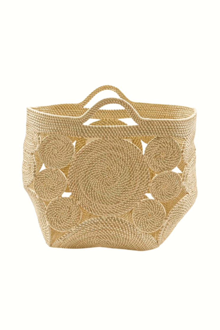 The Ibera Circle basket bag hand-knitted in espartillo fiber by artisans from Esteros del Iberá