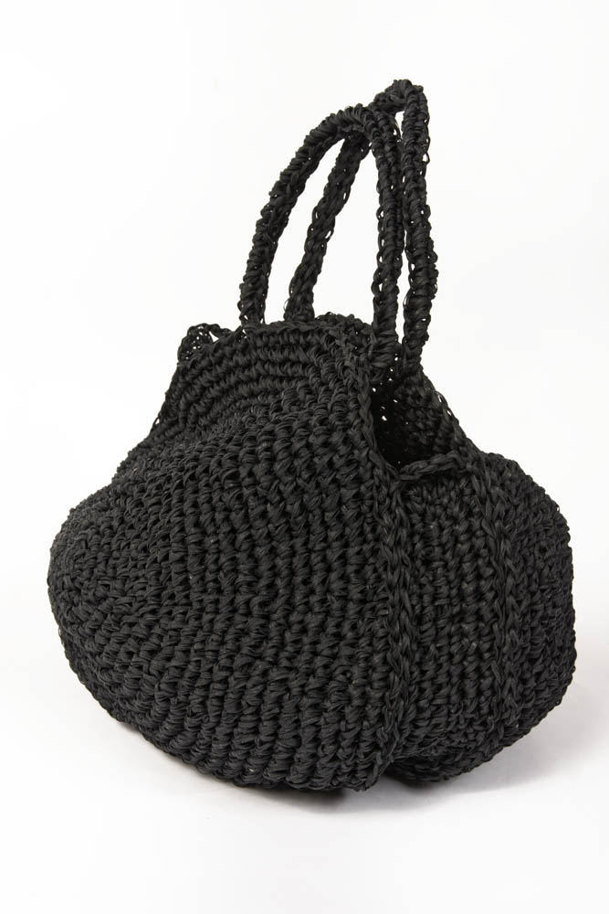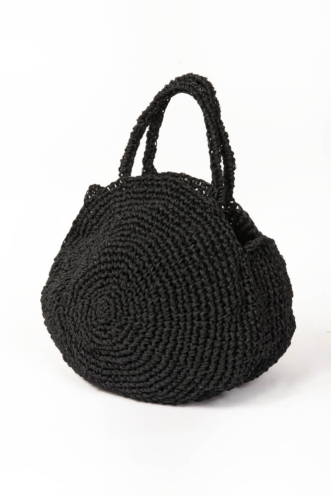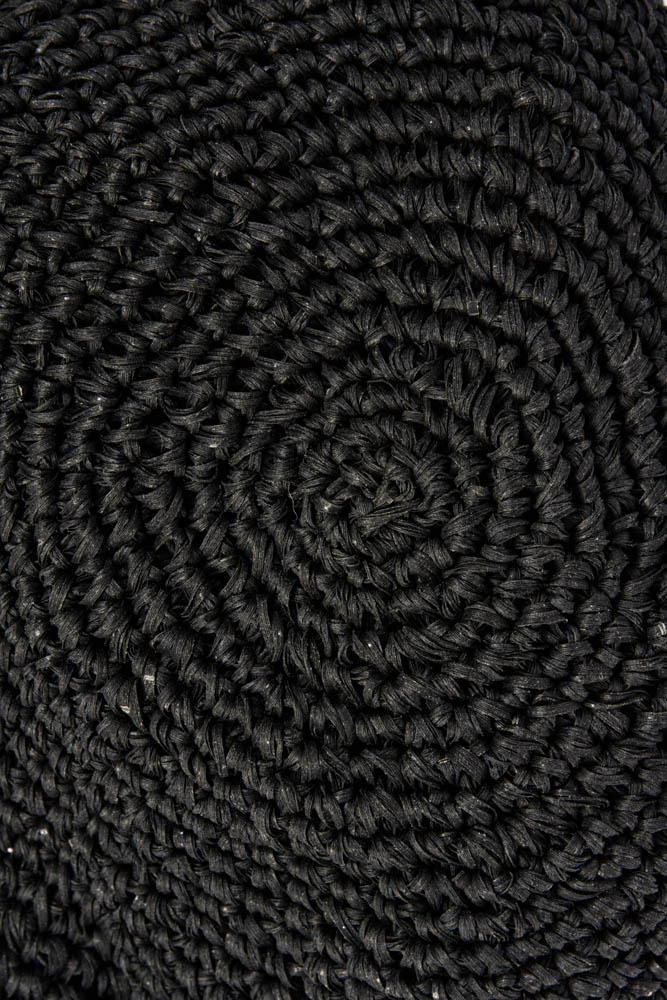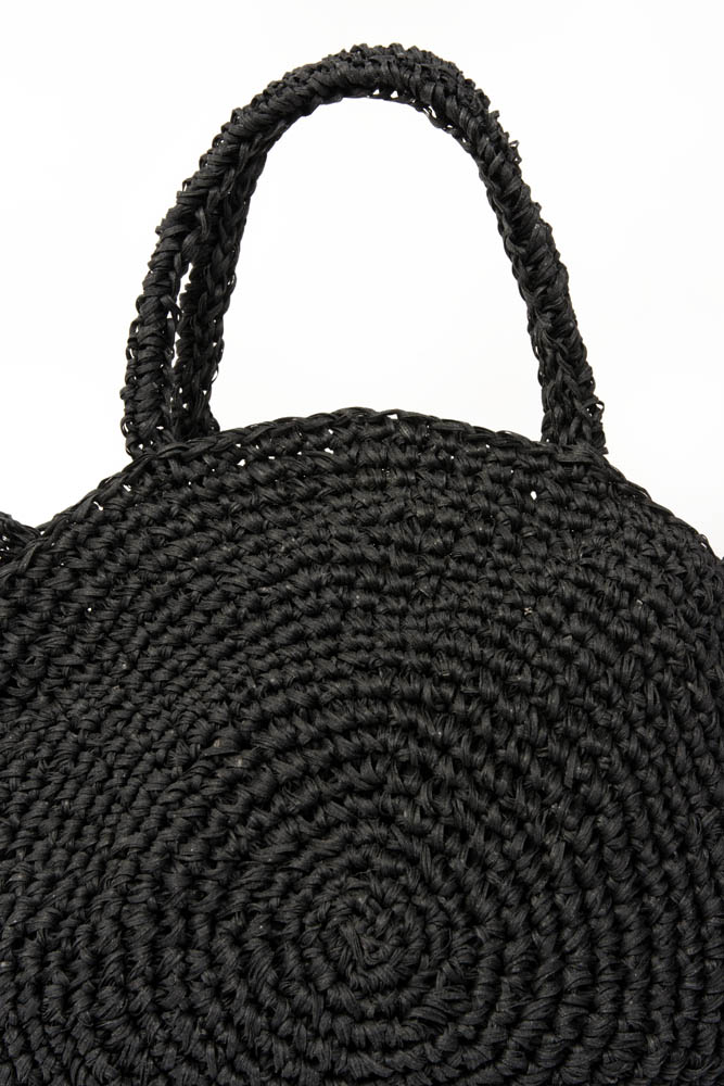Circular basket bag hand-woven in raffia fiber