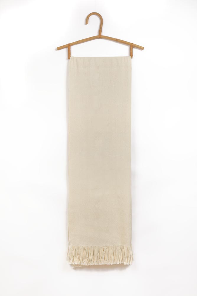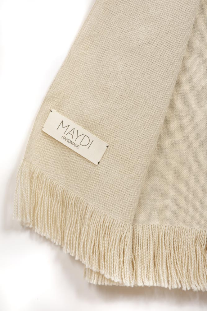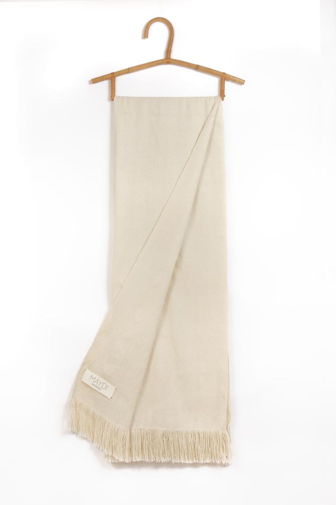 Loom-woven shawl warp and weft using a traditional a four-pedal loom in taffetan stitch with 400 threads